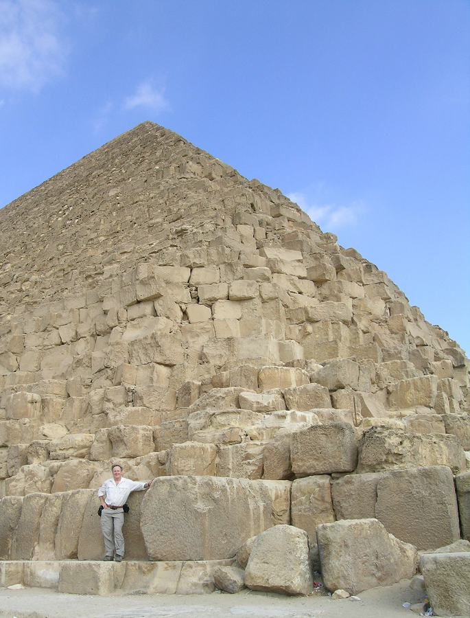 Of course, this is illegal. So I waited near sunset and all the tourists had gone, walked around to the northwest corner hidden from most views where there was one lonely guard. I gave him 20 Egyptian pounds which made him very happy, and up I went. Each block at the bottom is about five feet tall and gets smaller as you climb, with over 200 stone layers or “courses” base to apex. The top is flat, about 10-foot square – the limestone casing reaching a point gone long ago.